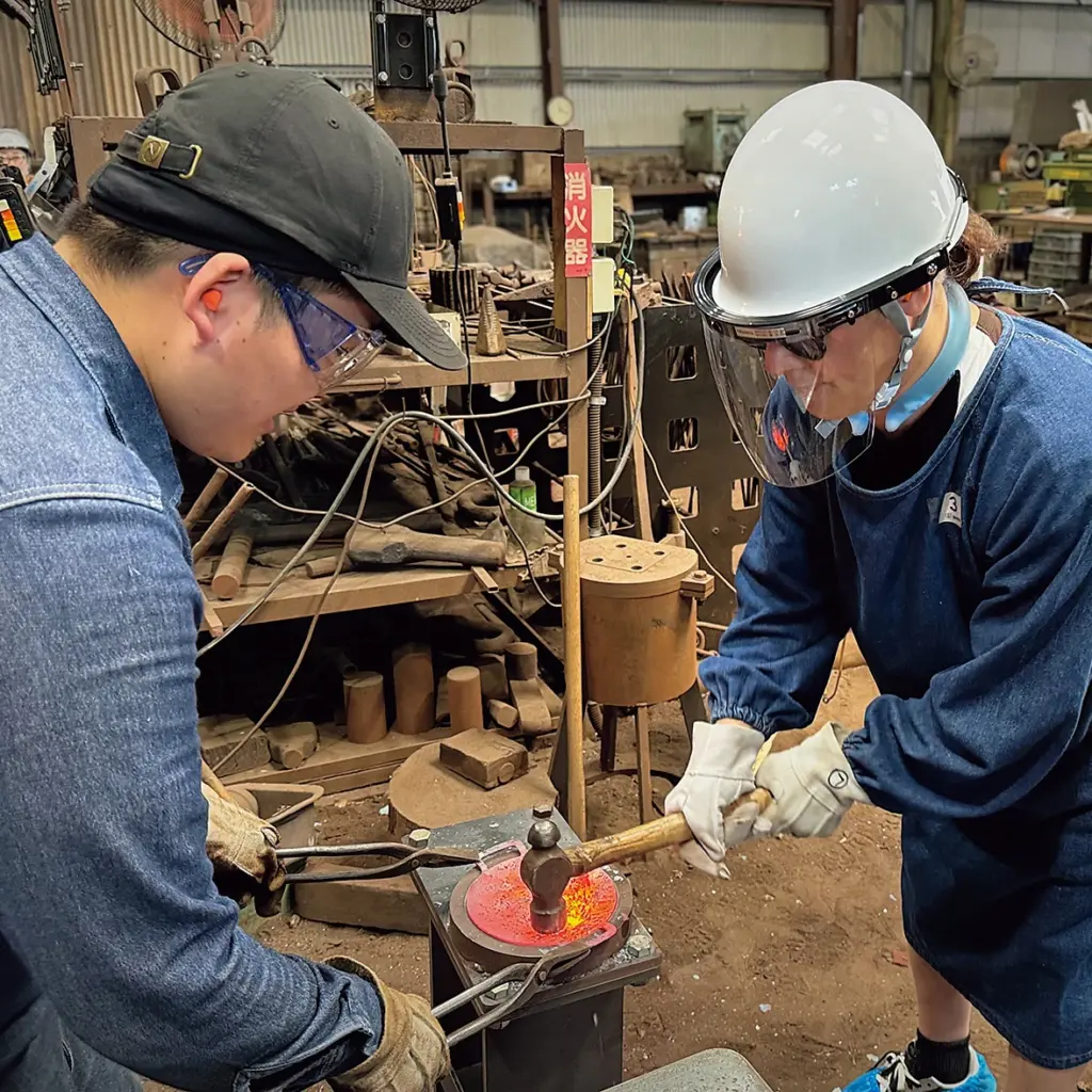 → 安全装備(ヘルメット、作業服、靴カバーなど)を着用し、金属を熱し、叩き、刻印して成形して完成、というプロセスを体験。