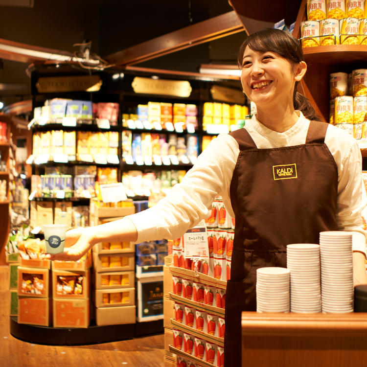 カルディコーヒーファームと言えば、入り口でコーヒーの試飲を配るスタッフの笑顔が印象的ですよね。