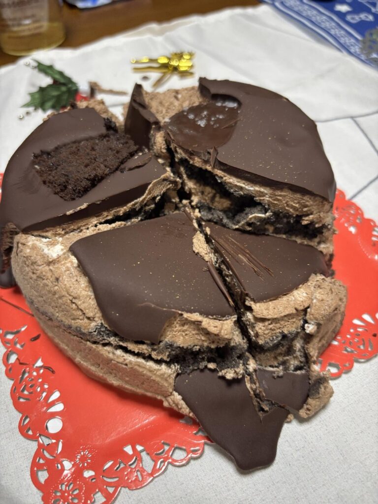 上のかかってるチョコソースみたいなのはグラサージュっていって砂糖とゼラチンとココアパウダーでできているので チョコを溶かしてかけてることがまずおかしい。。クリスマス直前でパティシエ飛んだんですかね 正直に謝るならまだしも、これはお金もらったらあきませんね