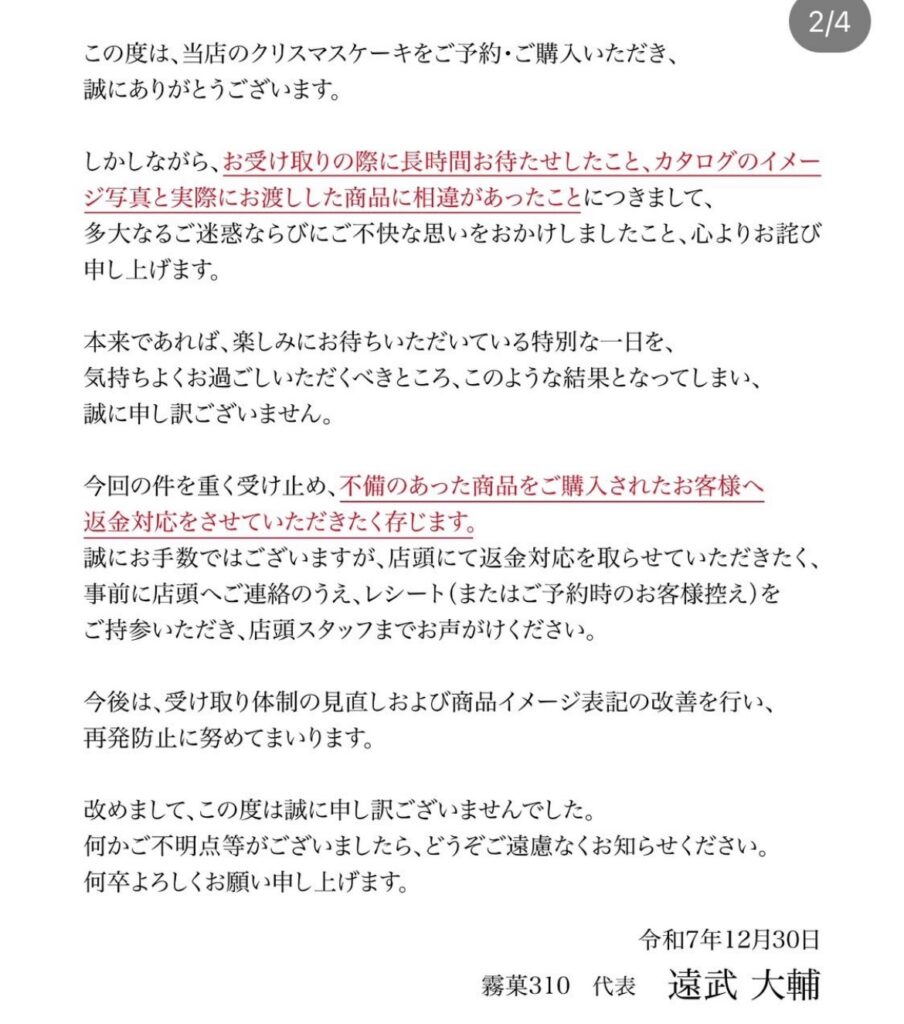 霧菓310は、クリスマスケーキの騒動後、Instagramのストーリーズで謝罪文を掲載しました。しかし、その内容が「紛失」「準備不足」といった言葉が中心で、具体的な改善策や補償についての言及が不足していたため、購入者からは「誠意が感じられない」という声が上がりました。