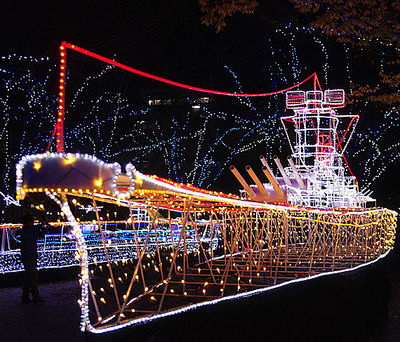 呉市は日本一の海軍工廠として栄えた歴史があり、戦艦「大和」が建造された地としても知られています。そのため、イルミネーションにも軍港の歴史を感じさせるデザインが取り入れられていたんですね。