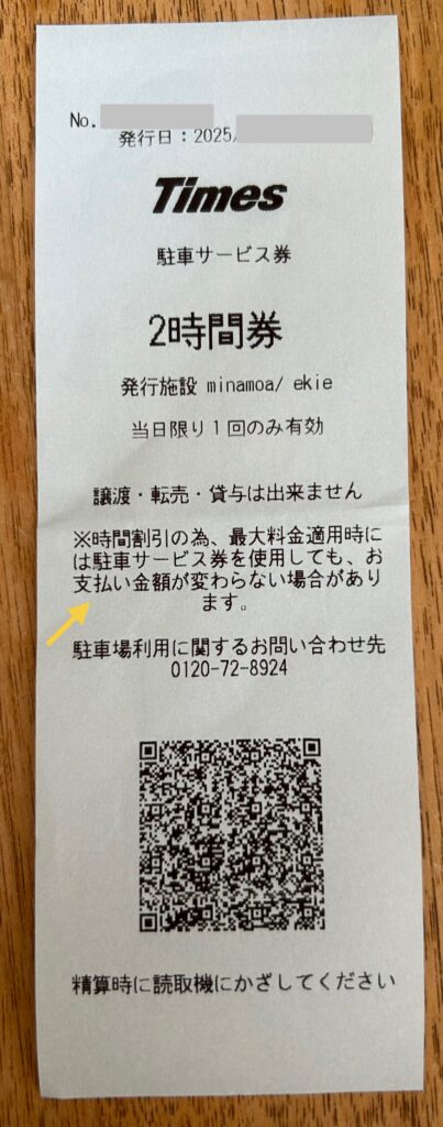 ① 時間サービス(例:2時間無料)※ミナモア駐車場&提携駐車場はこちらのタイプです