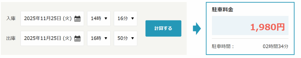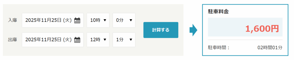 ABの駐車場も、エキキタ第2と同じ最大料金1600円なので似たようなシミュレーションになるのではないかと思います。(特別日の設定があるからか、ABについてはタイムズ公式サイトでもシミュレーションはできなくなっています)
