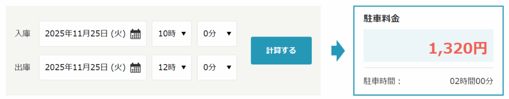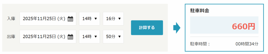 | 通常料金 | 4時間 = 8コマ × 330円 = 2,640円 |