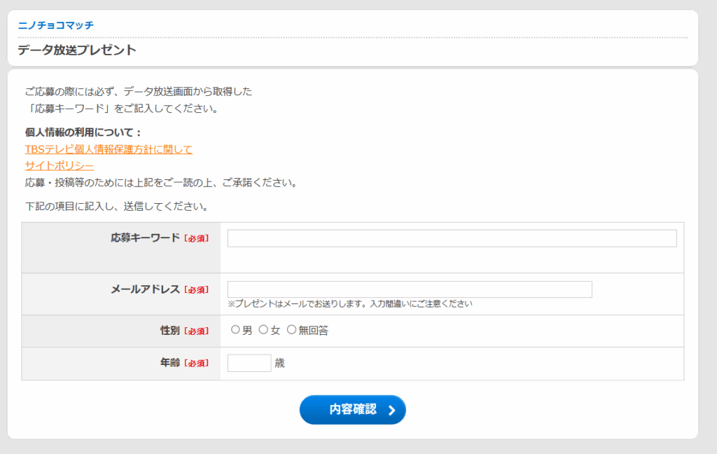 9月3日初回放送のニノチョコマッチでは、TBSホームページにある応募フォーマットが