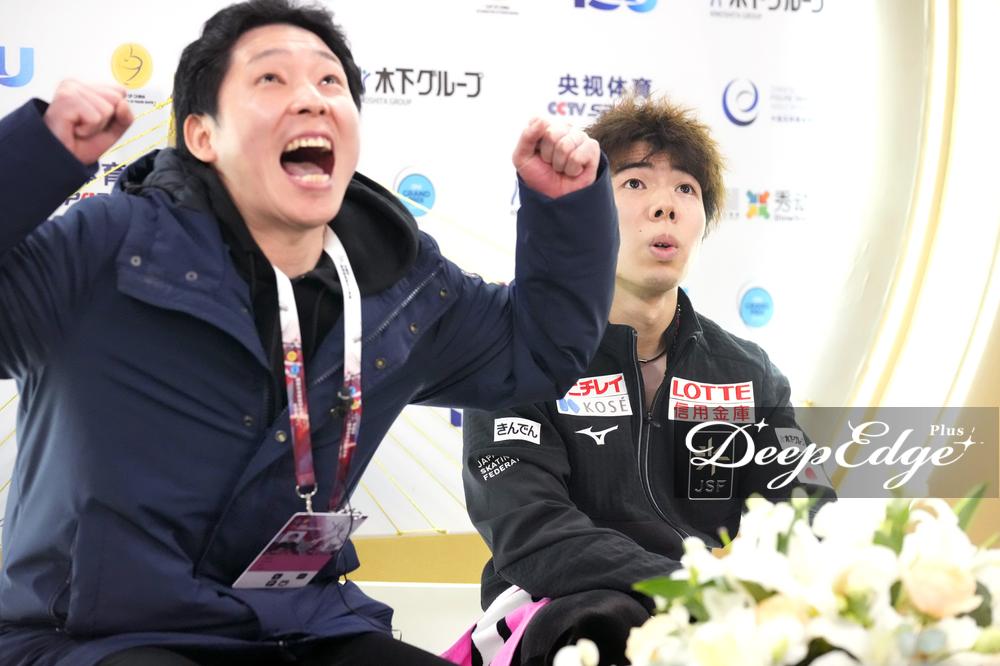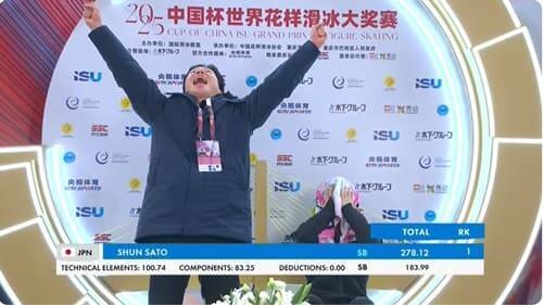 1. 2024年GP中国杯 初優勝時の絶叫ガッツポーズ 佐藤選手がGPシリーズ初優勝を飾ったこの大会。キスクラで両手を突き上げて喜ぶ師弟の姿が「リンクしている」と話題に。日下コーチの絶叫が会場に響き渡りました!