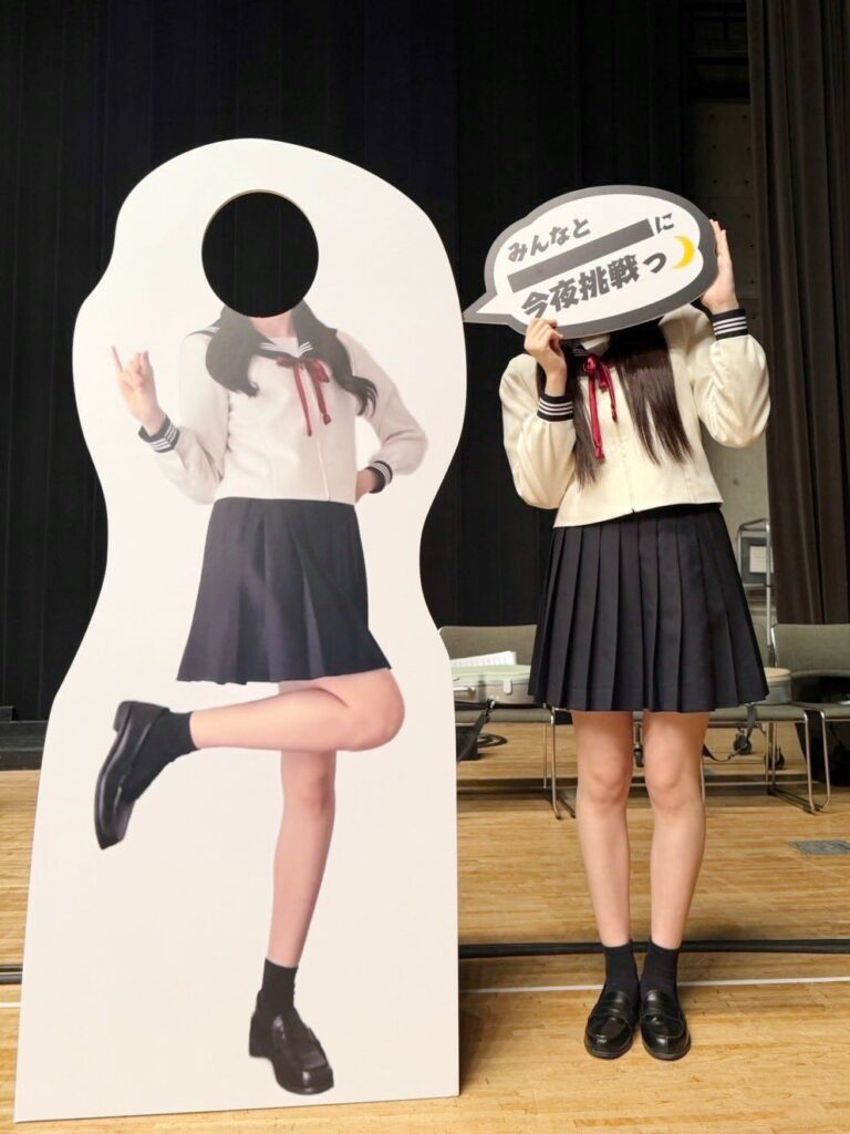 そして前日の2月10日、tuki.さん本人がXで「tuki.顔ハメ等身大パネルできた。武道館に置いとくから見つけてね。初ライブ楽しみだーーーーー」と投稿しました。添えられた写真は、ミニスカのセーラー服姿で顔ハメパネルの横に立つtuki.さんの姿。顔は見えないものの、長い脚とスラリとしたスタイルが印象的でした。